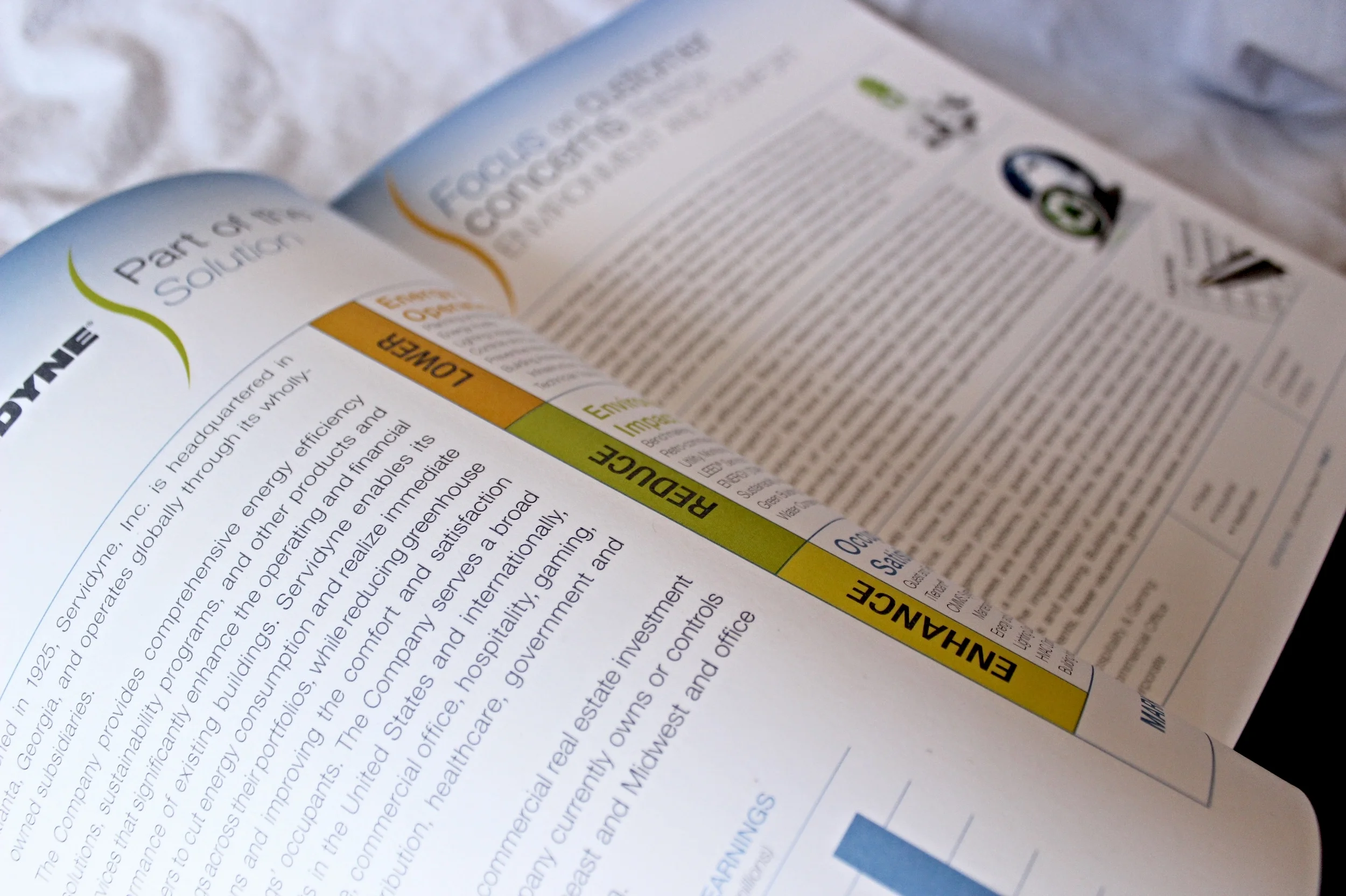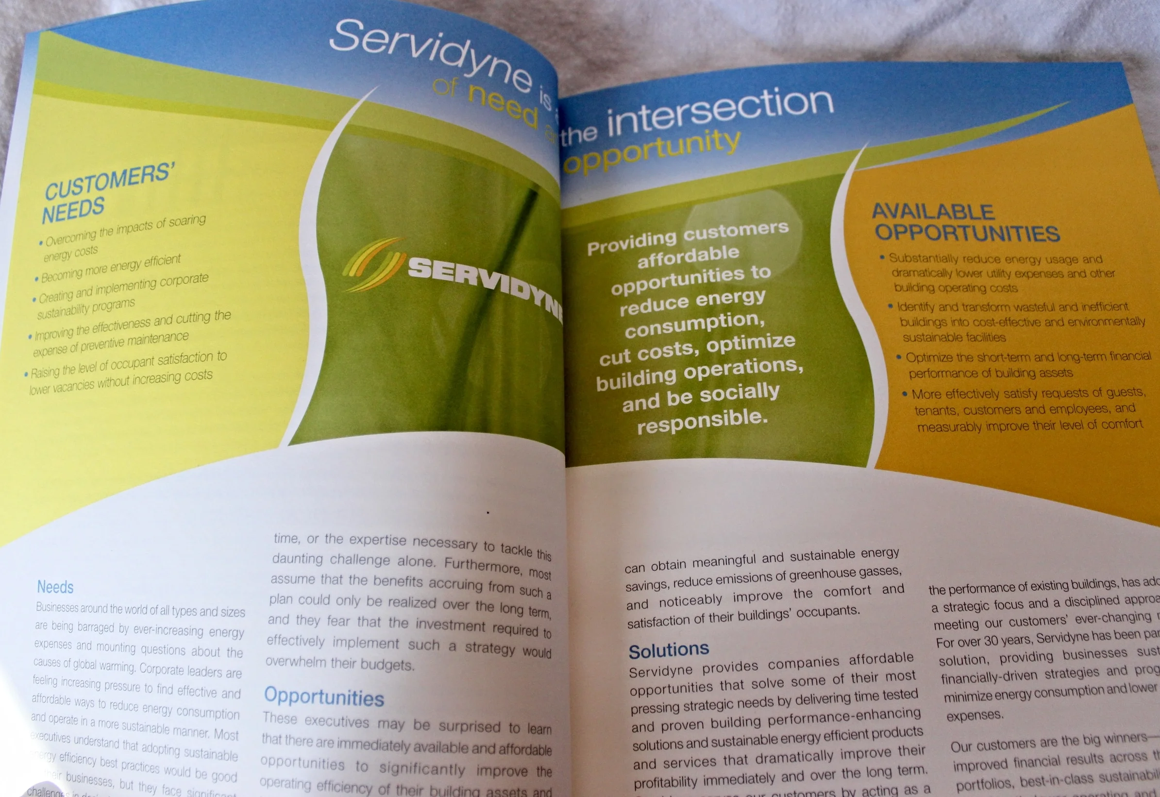 Servidyne provides comprehensive energy efficiency solutions. They were looking for something to incorporate their new brand. The annual report was printed on uncoated Neenah Environment paper with 2 spot colors and 4 color process, as well as soy based inks. It has a two color typeset financial section.